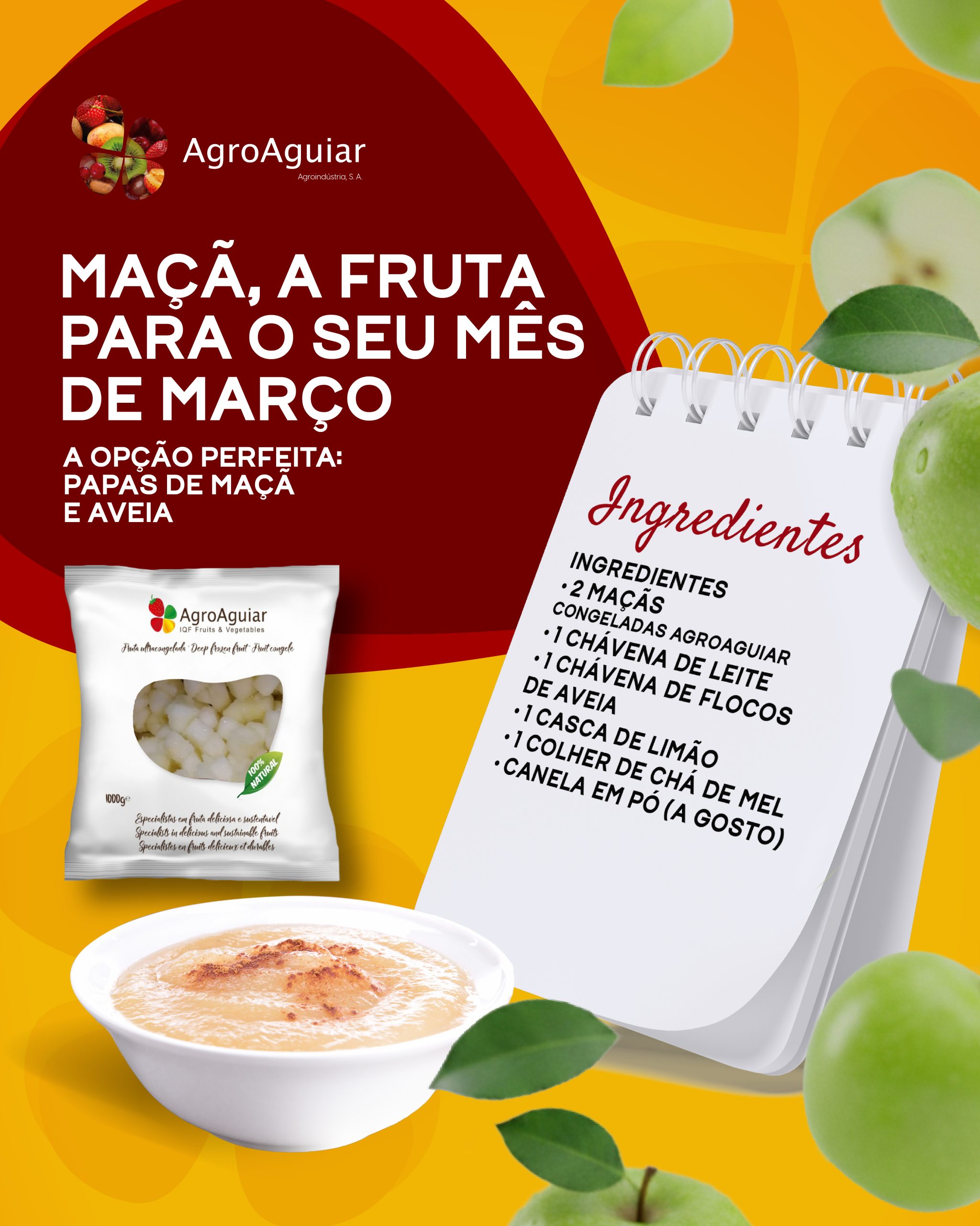 A fruta para o seu mês de março: Maçã Congelada AgroAguiar. 🍏 Versátil, prática e mais importante: Saborosa! Com a fruta da Agroaguiar, tem a dose certa de vitaminas que precisa. Prepare as suas papas de maçã e aveia.